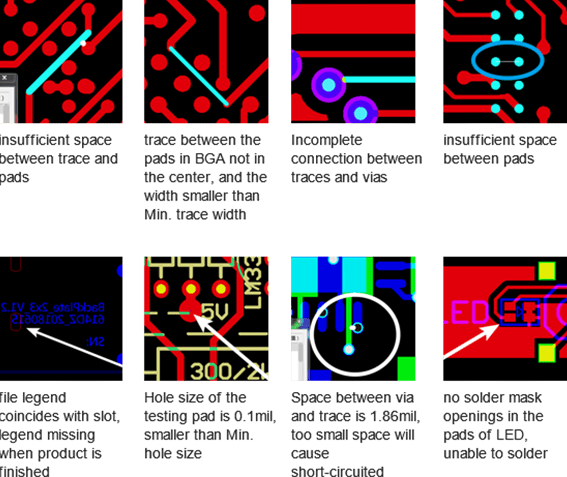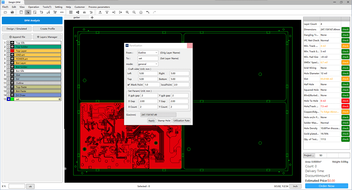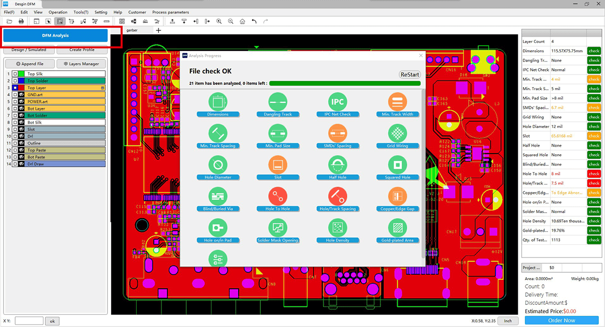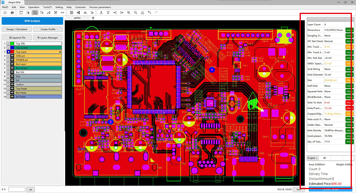 HQDFM can analyze the common problems of design with just one click. For Gerber files, HQDFM software can not only automatically recognize the layer type, file format, and alignment, but also can accurately locate the problems and offer the solution to optimize the problems with a combination of design-side problems, production-side problems, factory capabilities, and price factors. (see pic 3.2)