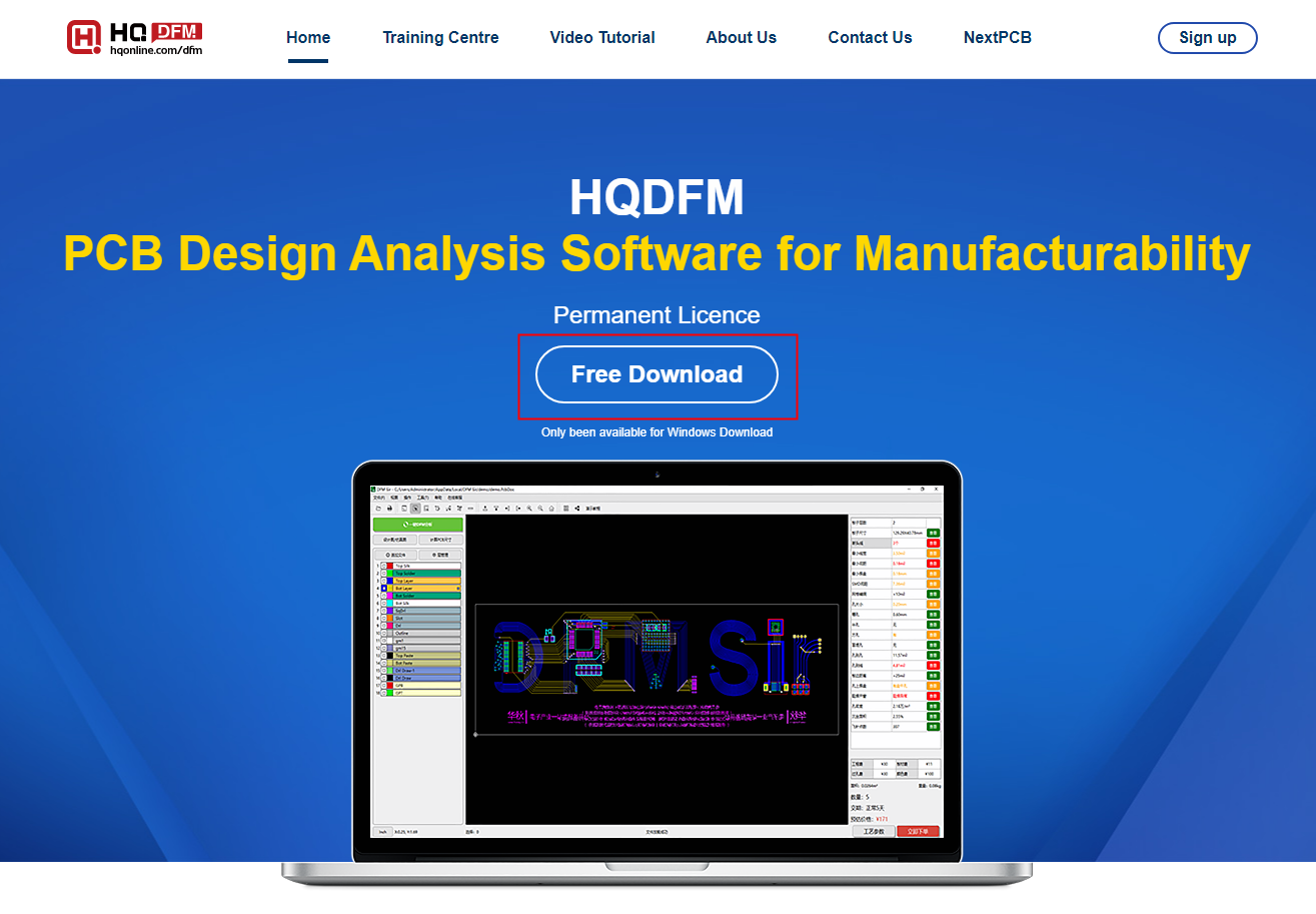 Open https://www.nextpcb.com/dfm.html and click Free Download (see pic 4.1.1), it occupies 512M, please keep enough space for operation. (Please note that HQDFM is only available in Windows systems for now: Win7/WinVista/Win2003/WinXP/Win8/Win10)